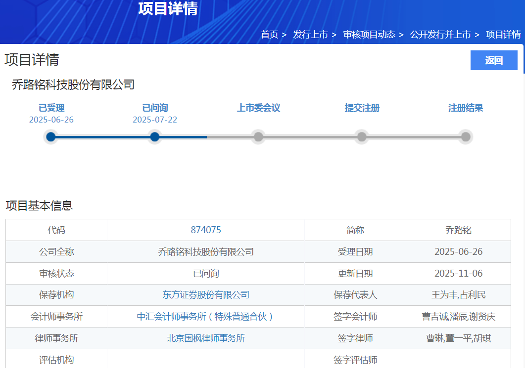 11月6日,乔路铭科技股份有限公司(以下简称“乔路铭”)在北交所网站更新上市申请审核动态,公司收到第二轮审核问询函,北交所追问的问题包括业绩增长可持续性以及收入确认的真实性等。