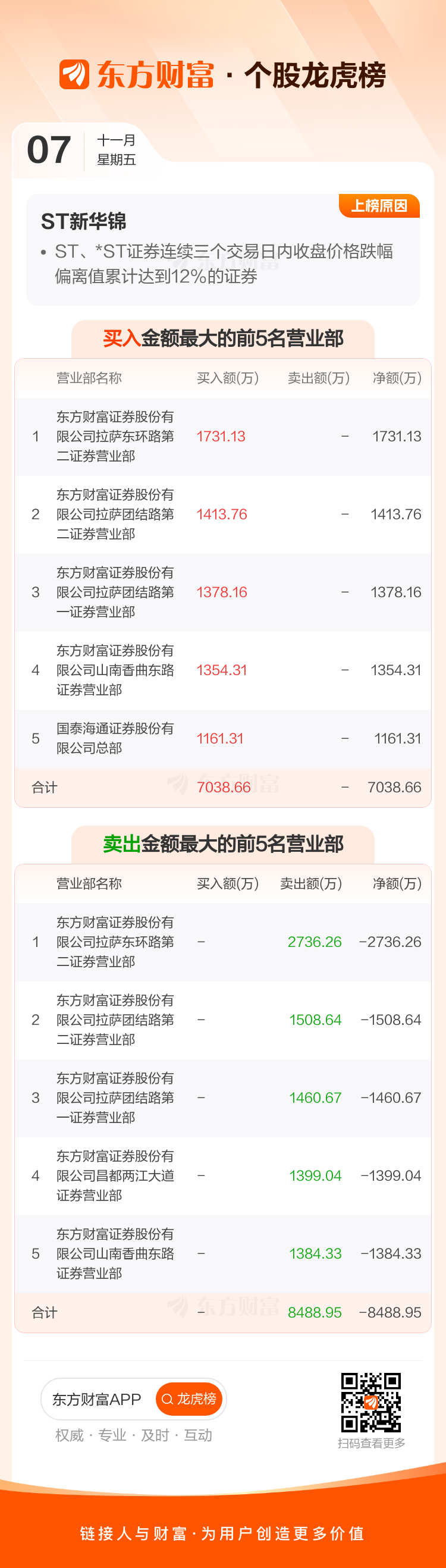 交易所2025年11月7日公布的交易公开信息显示,ST新华锦因成为ST、*ST证券连续三个交易日内收盘价格跌幅偏离值累计达到12%的证券上榜。ST新华锦当日收报6.63元,涨跌幅-4.60%,换手率10.96%,成交额3.10亿。异常期间11月5日至11月7日,期间涨幅-13.90%,累计偏离值-14.84%,区间成交额10.93亿。