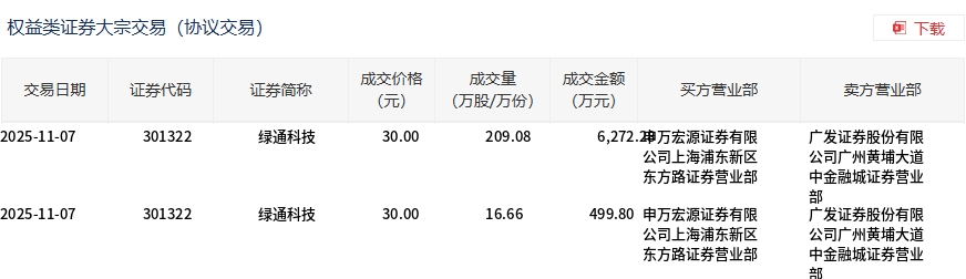 11月7日,绿通科技大宗交易成交225.74万股,成交额6772.08万元,占当日总成交额的68.7%,成交价30元,较市场收盘价29.96元溢价0.13%。