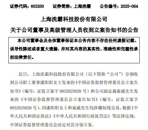 11月7日,上海洗霸(603200)公告,近日,公司分别收到职工董事潘阳阳发来的《中国证券监督管理委员会立案告知书》和副总裁索威发来的《中国证券监督管理委员会立案告知书》,因潘阳阳和索威均涉嫌短线交易,根据法律法规,中国证券监督管理委员会决定对其分别立案。