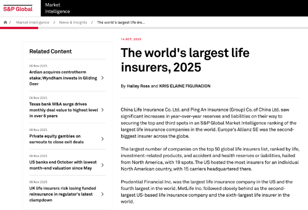 近期,标准普尔全球市场情报(S&P Global Market Intelligence)根据2024年寿险和健康险准备金以及独立账户/保险和投资合同准备金或负债,发布了全球寿险公司50强。中国人寿超越安联保险集团(Allianz Group),成为全球最大的寿险公司,中国平安列第三位。