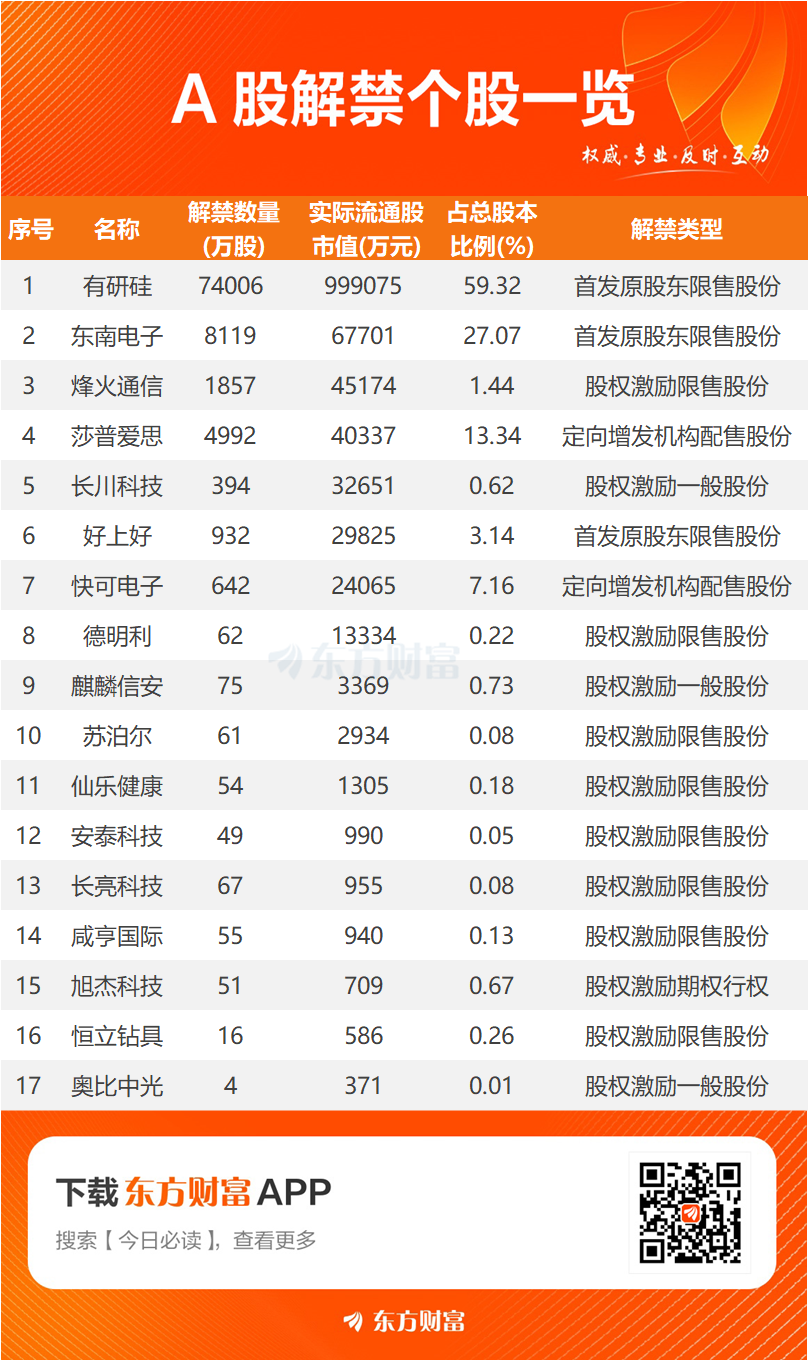 下周一17股解禁 有研硅、东南电子解禁市值居前