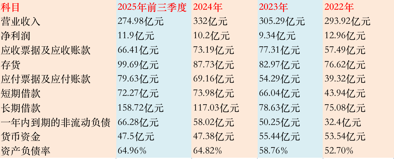 为应对经营所需,公司短期借款从2022年43.94亿元上涨到2025年前三季度的72.27亿元;长期借款同样从2022年75.08亿元翻倍至2025年前三季度的158.72亿元。截至2025年9月末,“一年内到期的非流动负债”达66.28亿元,同期的货币资金为47.5亿元,存在缺口。