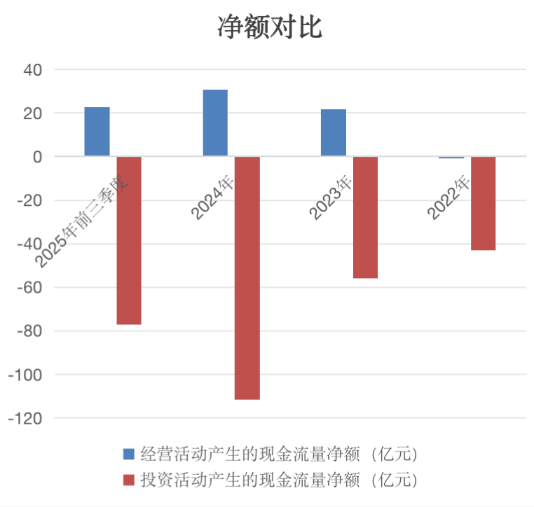 根据格林美的展望,2025年至2027年,公司规划销售收入目标分别为400+亿元、500+亿元与600+亿元。公司在建工程庞大(资产从2024年年初的27.3亿元增长至2025年9月末的76.28亿元),经营活动产生的现金流量净流入覆盖不了投资活动产生的现金净流出。