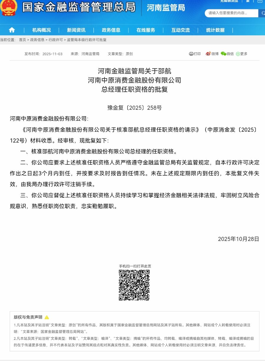 11月7日,国家金融监管总局河南监管局发布任职资格批复,核准邵航河南中原消费金融股份有限公司(下文简称“中原消费金融”)总经理的任职资格,邵航正式成为该公司第二任总经理。