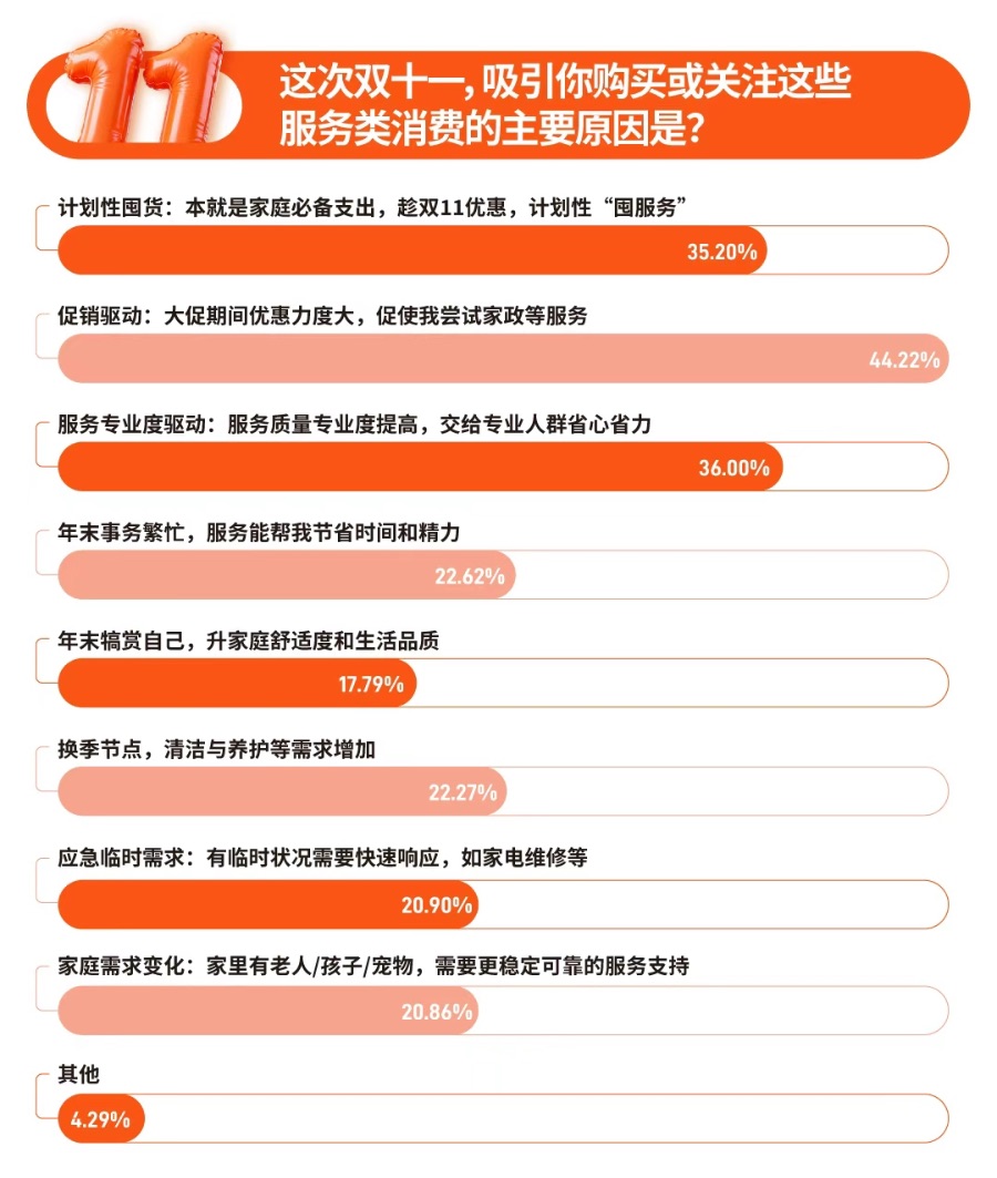 在服务型消费地位上升的同时,双十一成为消费者释放既有需求,集中囤货的最佳时机。调研显示,本次大促,消费者购买服务类消费的动机多样,“促销驱动”成为最主要的触发因素,44.22%的用户因“优惠力度大”而尝试或购买服务。其次,“服务专业度提升”和“计划性囤货”分别占比36.00%和35.20%,表明消费者对服务质量和长期价值的关注度上升,促销与品质并重成为决策关键。