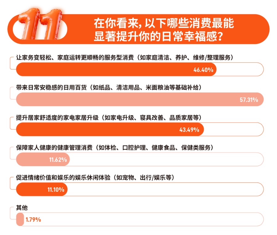 一、日用百货成双十一消费绝对主力,消费者通过生活细节规划显著提升幸福感