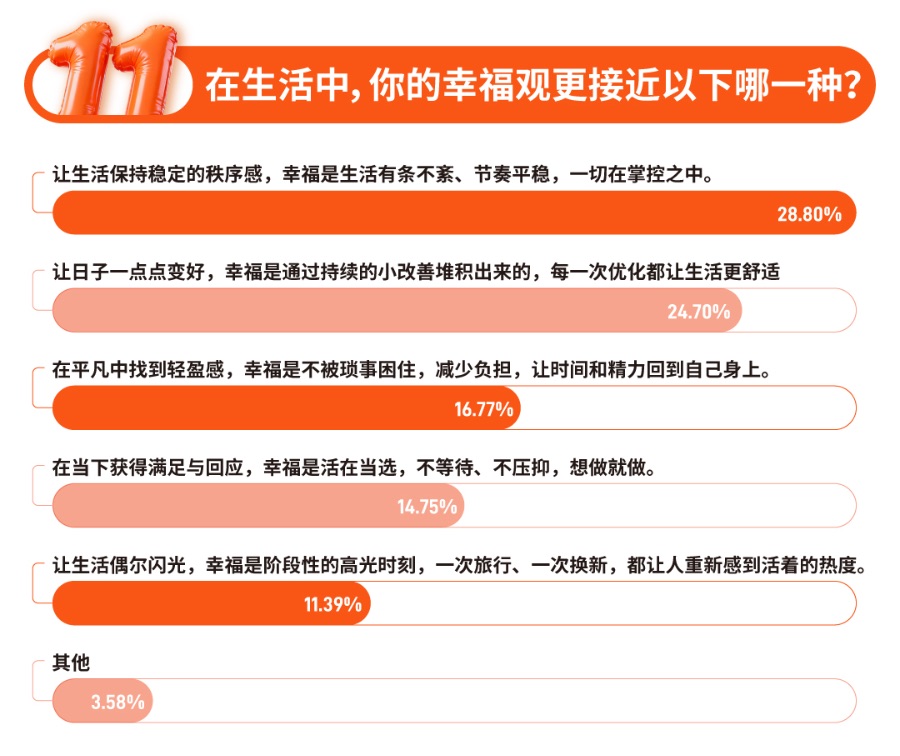 消费者的幸福观直接影响双十一家庭消费决策,五大核心幸福导向清晰呈现。“追求稳定的秩序感”最受认可,这解释了为何家庭会通过日用百货囤货避免临时缺漏,以维持生活可控性;“持续的小改善”则对应通过点滴消费优化生活的需求,比如选择品质更好的日用品、更专业的服务。