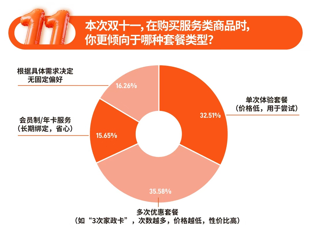 关于双十一期间消费者服务套餐偏好,35.58%的受访者选择“多次优惠套餐”,占比最大,其平衡了“价格折扣”与“使用灵活性”,适合中高频服务如保洁、洗车等。32.51%的受访者选择“单次体验套餐”,这是“新用户转化”的关键工具,低价降低了尝试门槛,优质服务则成为“复购”的起点。