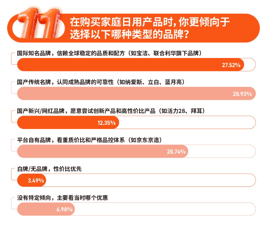 在日用百货产品的品牌选择偏好上,消费者呈现出明显的国产品牌倾向。