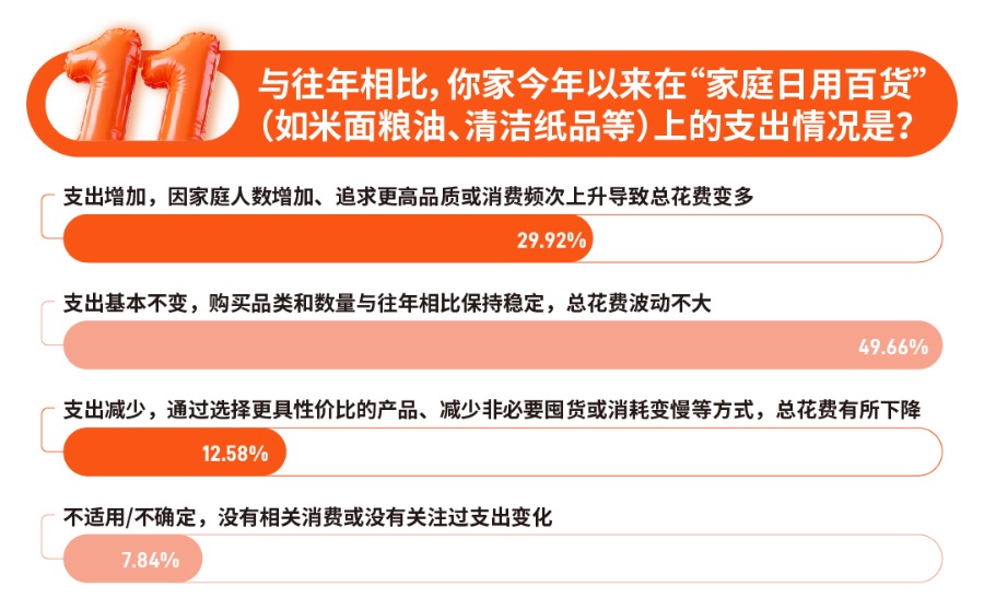 关于家庭日用百货支出的变化上,49.7%的家庭支出基本不变,29.9%的家庭支出增加,仅12.6%的家庭支出减少。整体来看,近80%的家庭日用百货支出保持稳定或增长。