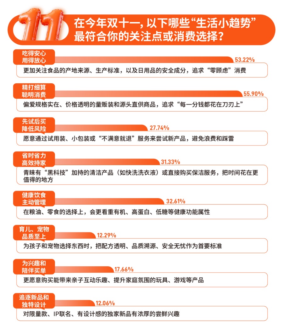 这两大趋势的高选择率,勾勒出当代消费者画像:精明又谨慎,既要省钱又要品质。他们不是盲目追求低价,而是在充分了解产品信息的基础上,做出最优选择。