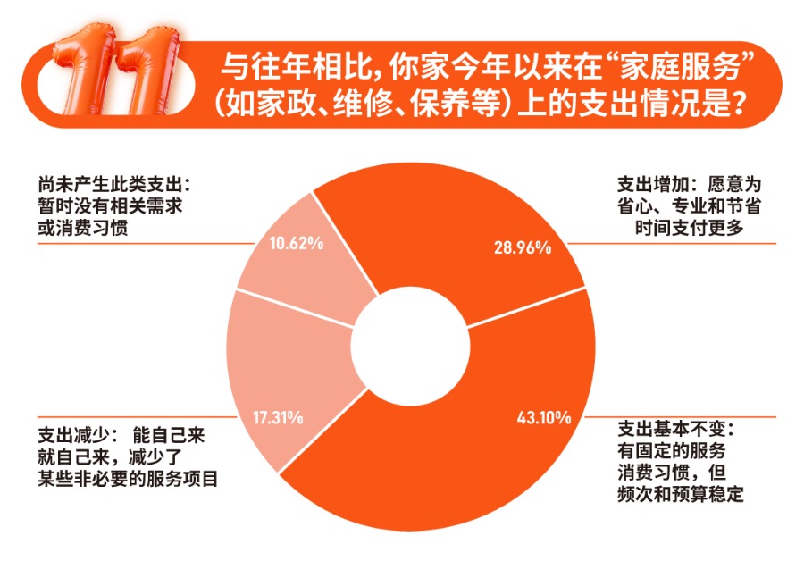 双十一期间,大家“囤”的不只是“商品”,还包括“服务”。家政、家电清洗、维修、护理等服务类消费正逐步从“可选”走向“刚需”。越来越多家庭将其视为解决家务难题、维持高效生活的优先方案或标配,尤其在双十一期间,服务类商品的关注与购买意愿显著提升。