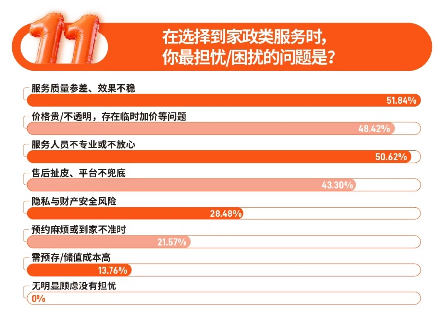 数据显示,消费者在家政服务中最担忧的问题前三位为:服务质量参差(51.84%)、服务人员不专业(50.62%)、价格不透明(48.42%)。