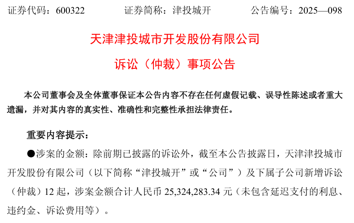 11月7日,津投城开(600322)发布公告,截止至公告披露日,公司及下属子公司新增诉讼(仲裁)12起,涉案金额合计2532万元,未包含延迟支付的利息、违约金、诉讼费用等。