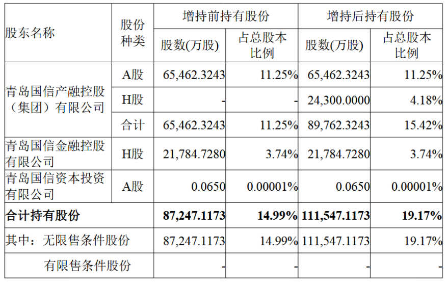青岛银行:获国信产融近9.57亿元增持,持股增至15.42%