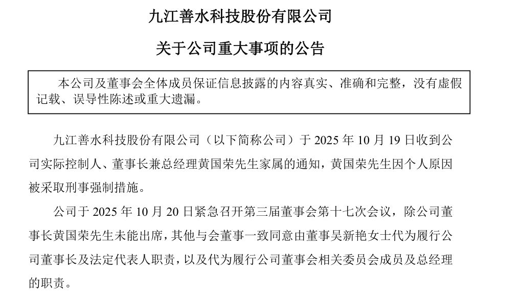 此前10月20日,善水科技发布公告称,10月19日收到公司实际控制人、董事长兼总经理黄国荣家属的通知,黄国荣因个人原因被采取刑事强制措施。
