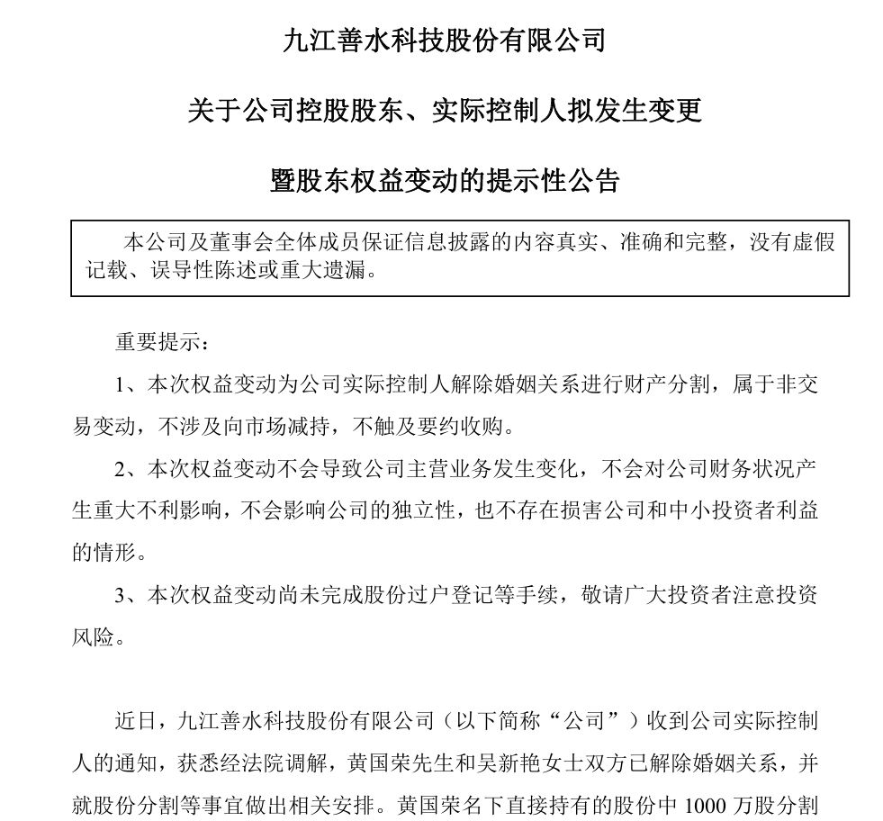 11月7日,善水科技(301190,股价24.38元,市值52.33亿元)公告,公司实际控制人黄国荣和吴新艳解除婚姻关系,并进行财产分割。黄国荣直接持有的股份中1000万股分割到吴新艳名下,黄国荣间接持有的股份,包括正祥投资财产份额2100万元(占合伙企业份额97.3123%)和泽祥睿宝投资财产份额690万元(占合伙企业份额38.6685%)分割到吴新艳名下。正祥投资全体合伙人、泽祥睿宝投资全体合伙人已分别一致表决同意其合伙企业的普通合伙人暨执行事务合伙人由黄国荣变更为吴新艳。