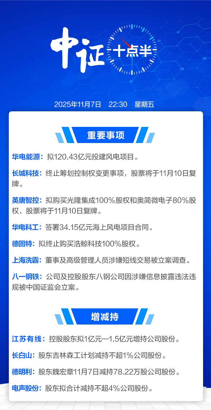 【中证十点半】华电能源拟逾120亿元投建风电项目;长城科技、英唐智控下周一复牌