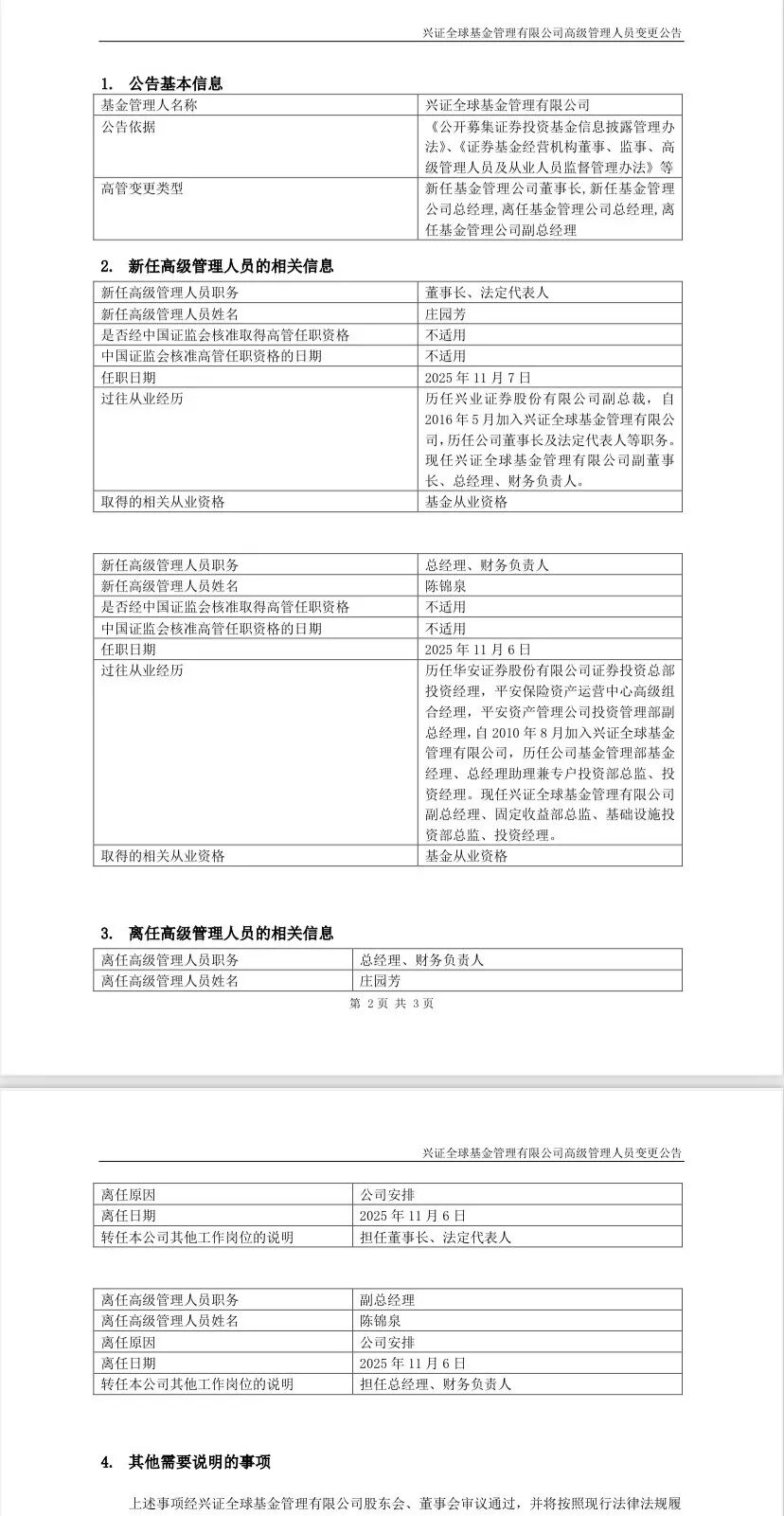 11月7日晚间,兴证全球基金发布公告,公司原总经理庄园芳升任董事长,公司原副总经理陈锦泉自2025年11月6日起担任公司总经理、财务负责人。