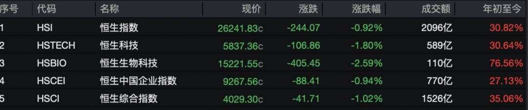 11月7日,港股三大指数集体下跌。其中,恒生指数收跌0.92%,报26241.83点;恒生科技指数下跌1.80%,报5837.36点;恒生中国企业指数下跌0.94%,报9267.56点。