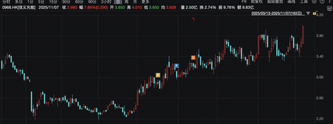 11月7日,信义光能收涨7.86%,福莱特玻璃收涨9.00%,协鑫科技收涨6.52%,新特能源涨2.24%。