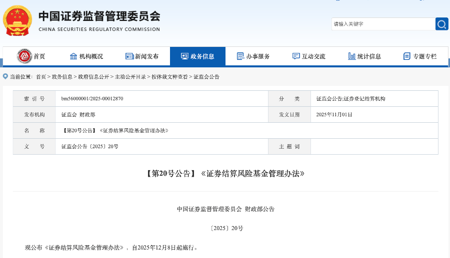 11月7日证监会与财政部联合发布新修订的《证券结算风险基金管理办法》(以下简称《办法》),宣布自2025年12月8日起正式实施。