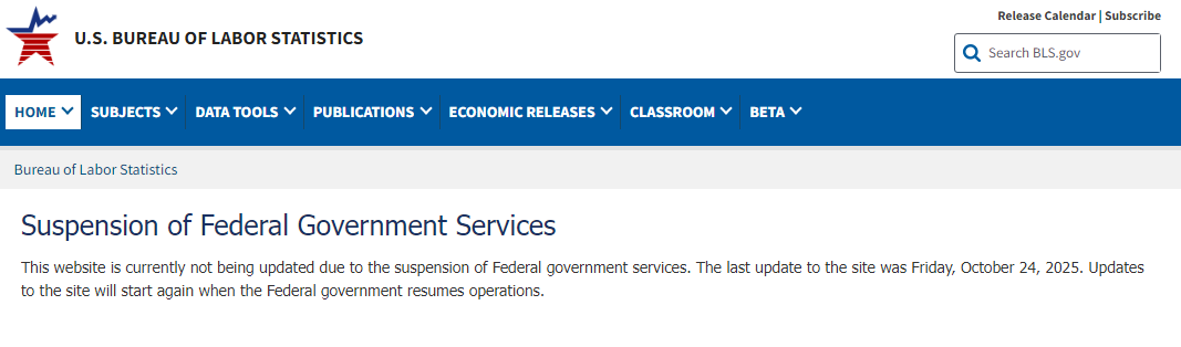 美国劳工统计局的官网公告称,“由于联邦政府服务暂停,本网站暂不更新。”该网站最近一次的更新时间为2025年10月24日。