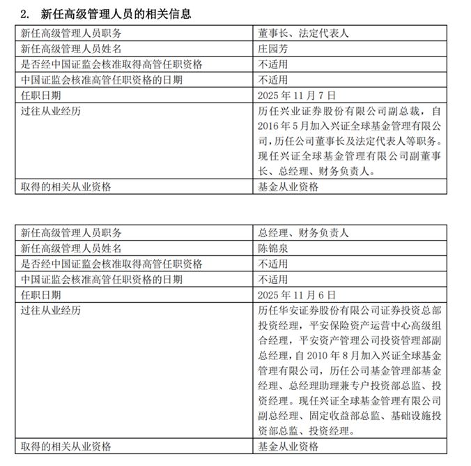 11月7日晚间,兴全基金发布高管变更公告,显示该公司副董事长、总经理、财务负责人庄园芳新任董事长。