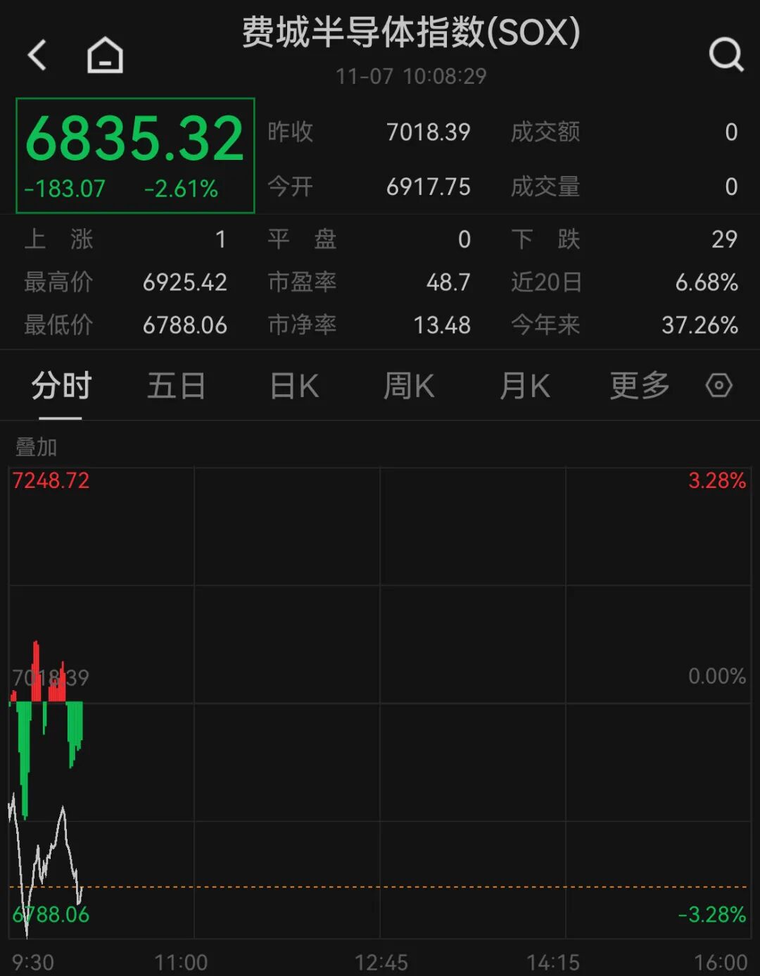 费城半导体指数跌至两周多以来的最低点,跌幅达2.61%。