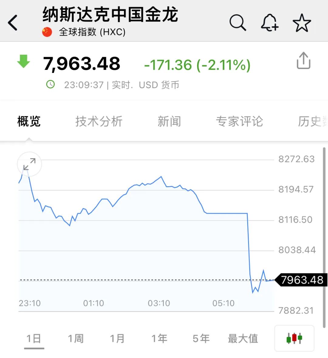 纳斯达克中国金龙指数跌幅扩大,现跌2.11%,最新报7963.48点。小鹏汽车跌超5%,哔哩哔哩、阿里巴巴跌超3%,京东跌超2%,理想汽车、百度跌超1%。