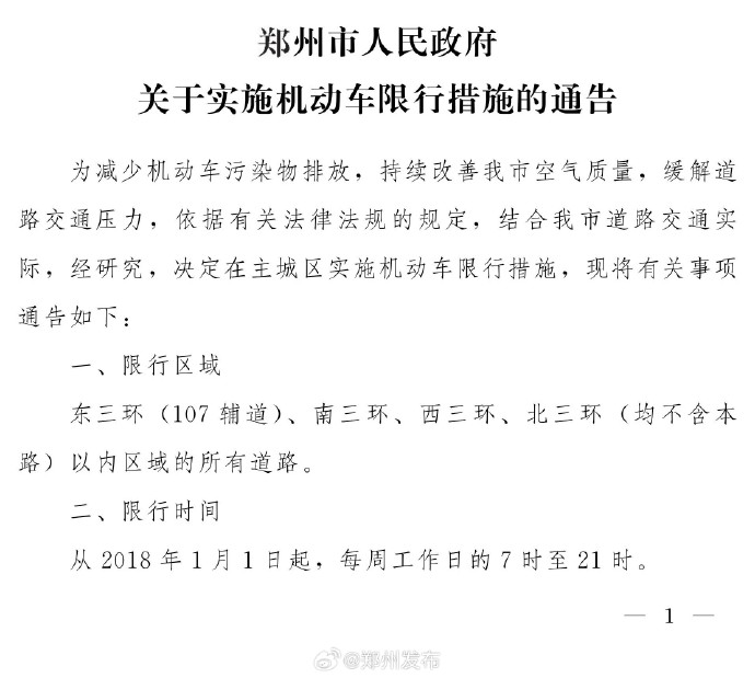 郑州市生态环境保护工作专班办公室11月7日发布通知,进入秋冬季以来,郑州市环境空气质量改善压力持续增大。为减少机动车污染物排放,缓解道路交通压力,提升城市管理效能,保障群众身体健康和城市道路交通有序运转,经研究,决定自2025年11月10日起恢复执行《郑州市人民政府关于实施机动车限行措施的通告》(郑政通〔2017〕42号)有关规定。