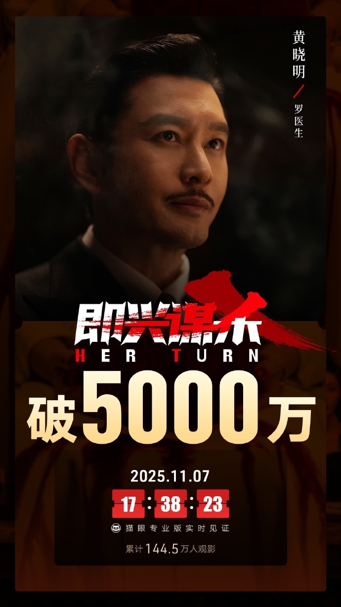 据猫眼专业版数据,电影《即兴谋杀》上映8天,总票房破5000万。