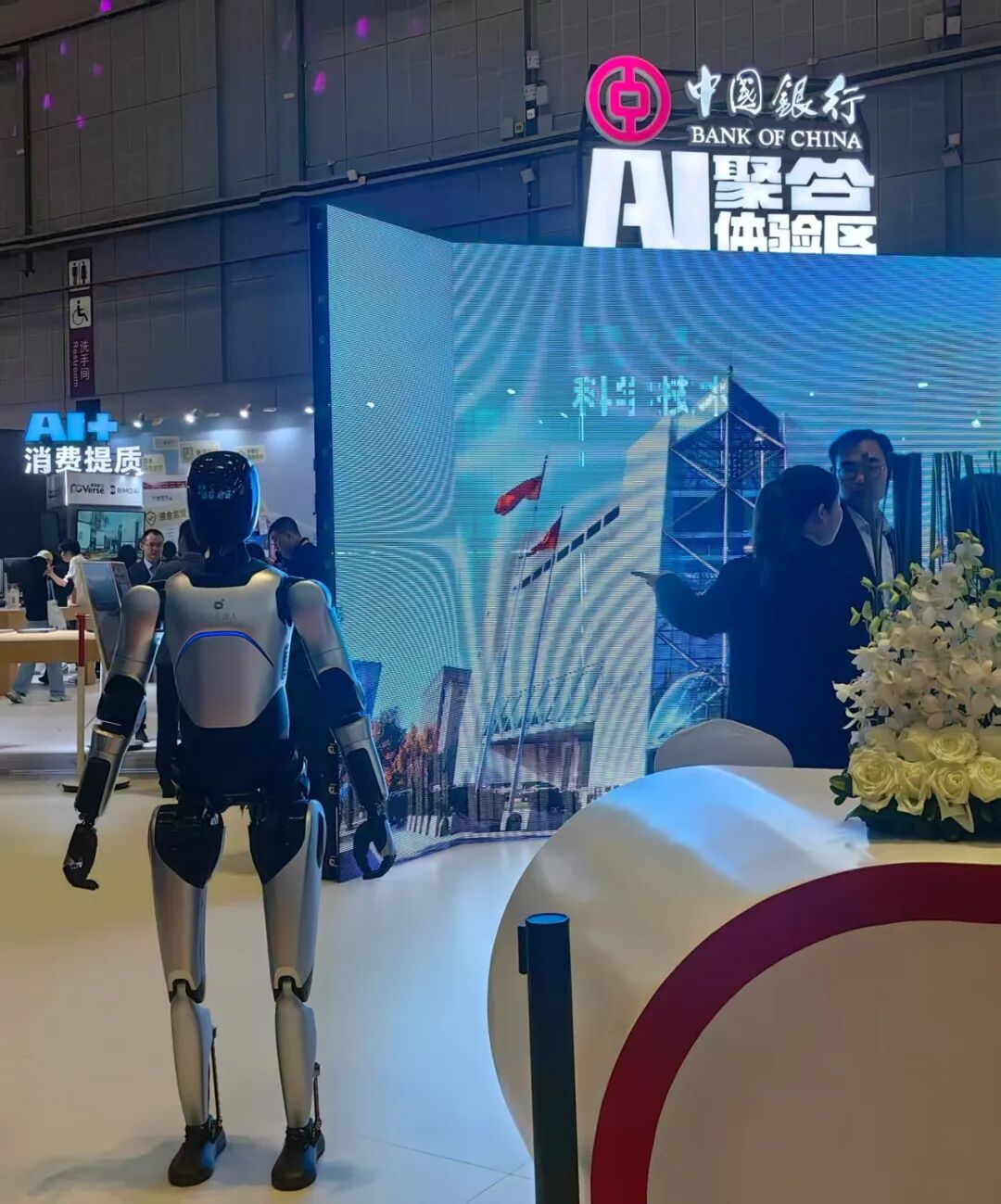 走进位于技术装备展区的中国银行AI聚合体验区,宇树科技的机器人正自如地“逛展”,智元机器人的机器狗也随处漫步。这是中国银行焕新升级的人工智能体验区4.0版本。“中国银行已经连续第四年作为联合主办方支持打造进博会的人工智能体验区,今年进一步扩大了展区规模,从往年的600多平方米升级到了1700多平方米,邀请了20多家人工智能企业的代表参展。”中国银行展台工作人员向记者介绍道。