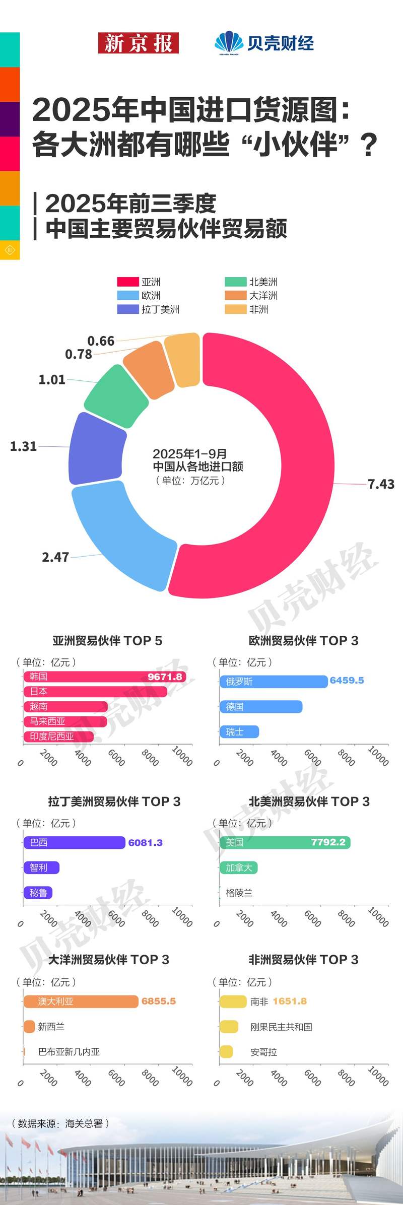 从进口来源看,亚洲仍是中国最大的进口来源地区,今年前三季度进口额达7.43万亿元,同比增长4.2%;非洲则是增速最快的地区,前三季度进口额为0.66万亿元,同比增长4.3%。其中,韩国和日本分别以9671.75亿元和8555.67亿元的进口规模位列中国前两大进口来源国;非洲方面,年内中国自南非、刚果(金)的进口额均突破1000亿元。
