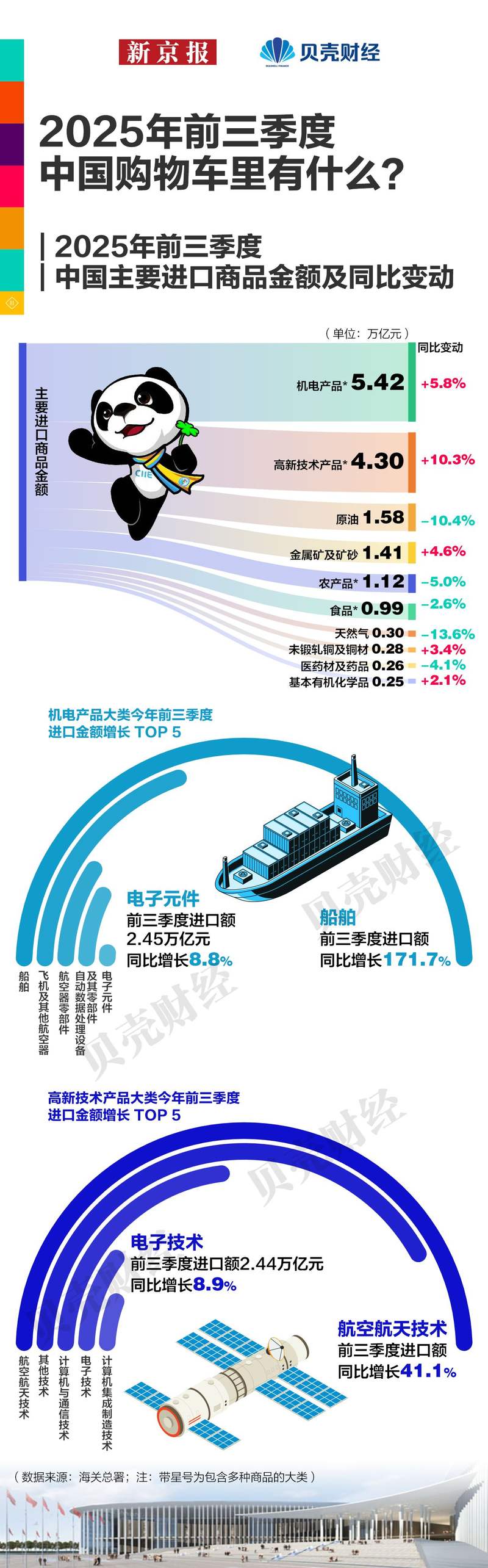 高新技术产品方面,前三季度进口总额约4.3万亿元,同比增长10.3%。其中,航空航天技术产品以41.1%的增速成为拉动增长的主引擎,进口额约0.2万亿元;作为该大类中最主要的细分类目,电子技术产品累计进口额达2.44万亿元,同比增长8.9%。