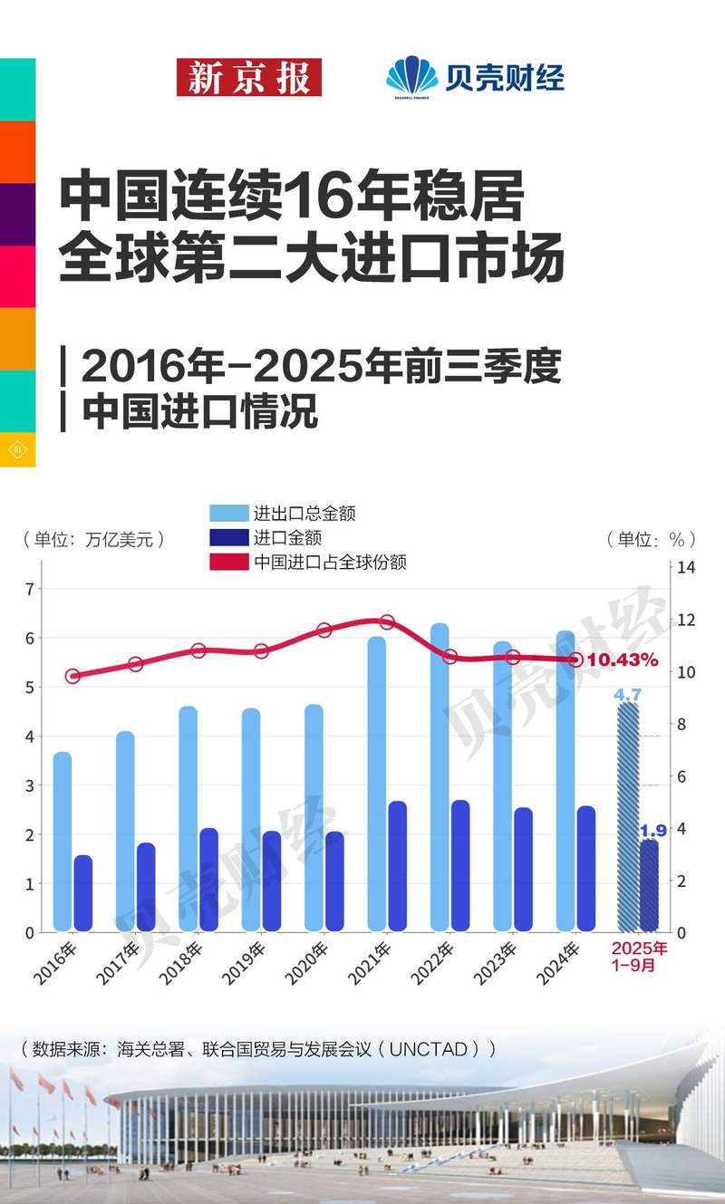 目前,中国已连续十六年稳居全球第二大进口市场,进口规模约占全球总份额的十分之一。
