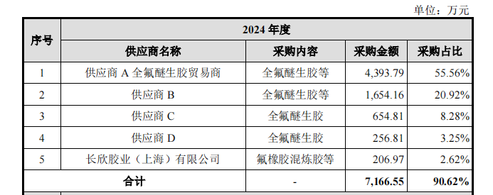 2024年,公司对单一贸易商“供应商A”的全氟醚生胶采购比例甚至超过50%,在全球贸易摩擦频发背景下如此之高的单一来源凸显了公司供应链存在的风险。