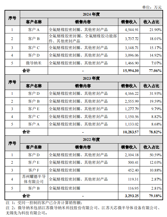 在已披露的前五大客户中,除微导纳米、苏州耀德半导体外,其余三家未公开名称。公司披露,报告期内有3家主要客户通过间接持股方式持有公司权益,且持股比例均不超过4%。