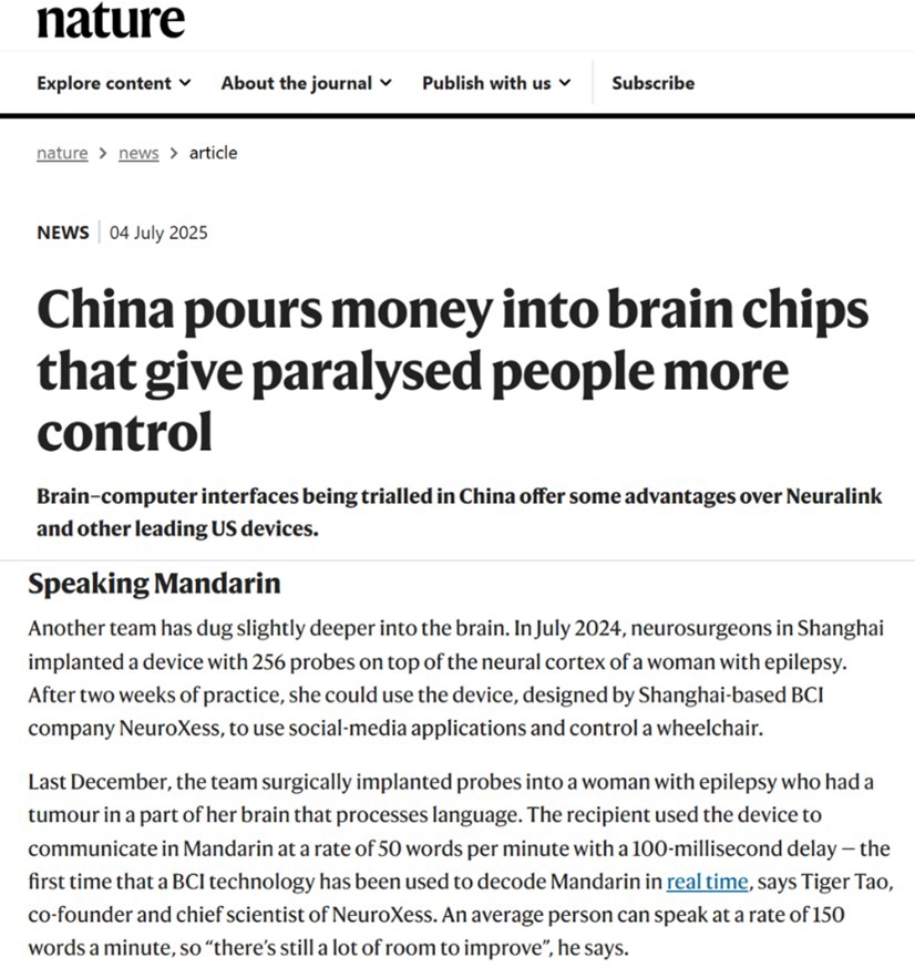 此前,Nature官网也对该成果进行了报道。中国在汉语言脑机接口领域,已跻身国际领先行列。