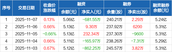 雅戈尔融资融券信息显示,2025年11月7日融资净偿还681.55万元;融资余额5.06亿元,较前一日下降1.33%