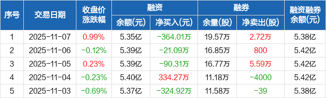 融资方面,当日融资买入1019.27万元,融资偿还1383.27万元,融资净偿还364.01万元,连续3日净偿还累计475.4万元。融券方面,融券卖出2.74万股,融券偿还200股,融券余量19.57万股,融券余额339.85万元。融资融券余额合计5.38亿元。