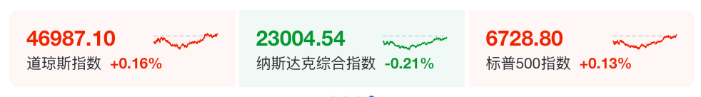 美国三大股指低开后延续跌势,纳指日内跌幅一度扩大至2%,尾盘转涨。截至收盘,道指涨0.16%,报46987.1点;标普500指数涨0.13%,报6728.8点;纳指跌0.21%,报23004.54点。