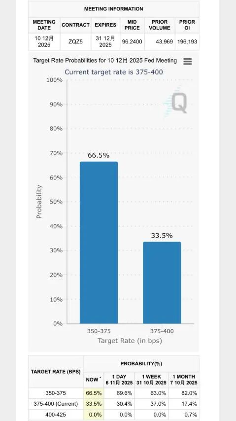 在数据真空的背景下,美联储内部关于12月是否降息的争论愈发激烈。分析师预测降息概率出现分歧,最新数据显示,美联储12月降息25个基点的概率为66.5%,维持利率不变的概率为33.5%。