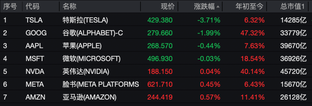 板块方面,科技股回调拖累纳指,万得美国科技七巨头指数跌0.56%,特斯拉跌3.71%,英伟达尾盘转涨,此前一度跌近5%。本周,万得美国科技七巨头指数已累跌3.21%。