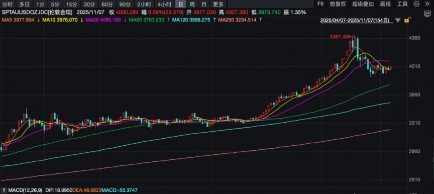 黄金市场本周延续剧烈震荡,在美国政府长期停摆和规避美股风险等背景下,11月7日金价有所反弹,现报4000美元/盎司,本周累计微跌0.06%。