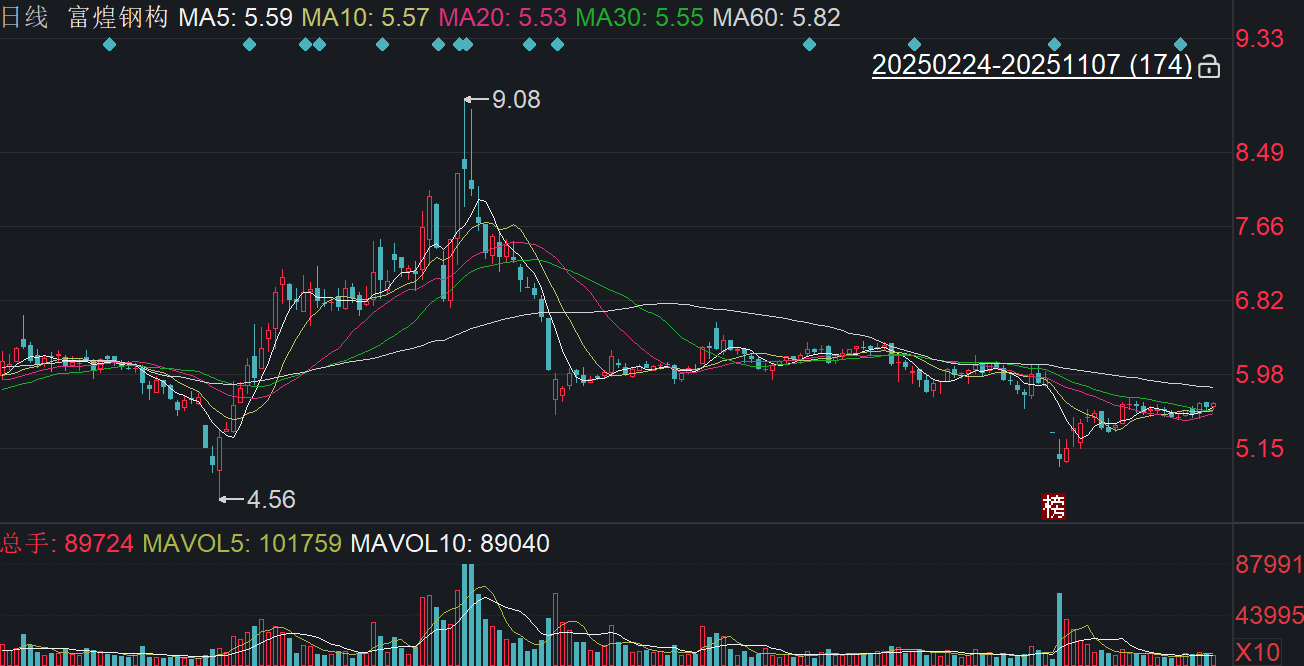 二级市场上,截至11月8日收盘,富煌钢构上涨0.71%报5.64元/股,总市值约24.55亿元,今年来公司股价累计下跌约14%。