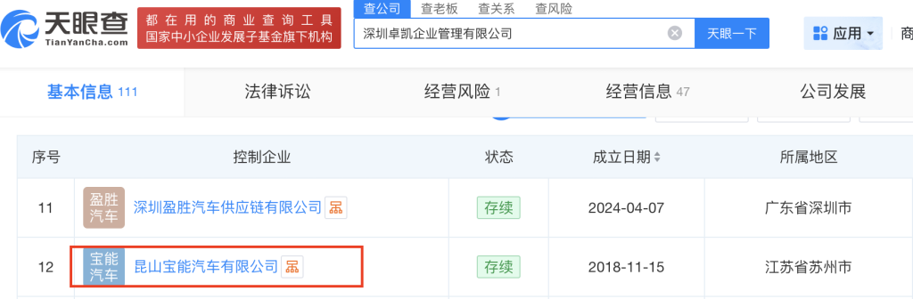 此外,深圳翔飞汽车销售有限公司的股东深圳卓凯企业管理有限公司间接投资了昆山宝能汽车有限公司,昆山宝能汽车有限公司的唯一股东为深圳欣硕企业管理有限公司,深圳卓凯企业管理有限公司是深圳欣硕企业管理有限公司的控股股东,也就是昆山宝能的控股股东,其法定代表人、执行董事、总经理皆为黄晶。