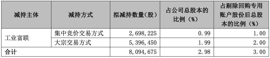 持有公司股份39,971,265股(占公司总股本比例14.73%,占剔除公司当前回购专用账户股份后总股本比例14.81%)的大股东富士康工业互联网股份有限公司,计划自本公告披露之日起十五个交易日后的3个月内以集中竞价交易方式及大宗交易方式减持公司股份不超过8,094,675股(占公司总股本比例不超过2.98%,占剔除公司当前回购专用账户股份后总股本比例不超过3.00%)。