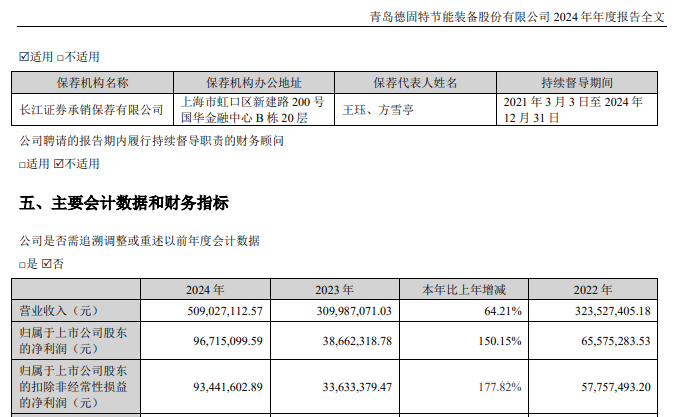 2022年至2024年,德固特的归母净利润分别为6557.53万元、3866.23万元、9671.51万元,扣非后净利润分别为5775.75万元、3363.34万元、9344.16万元。